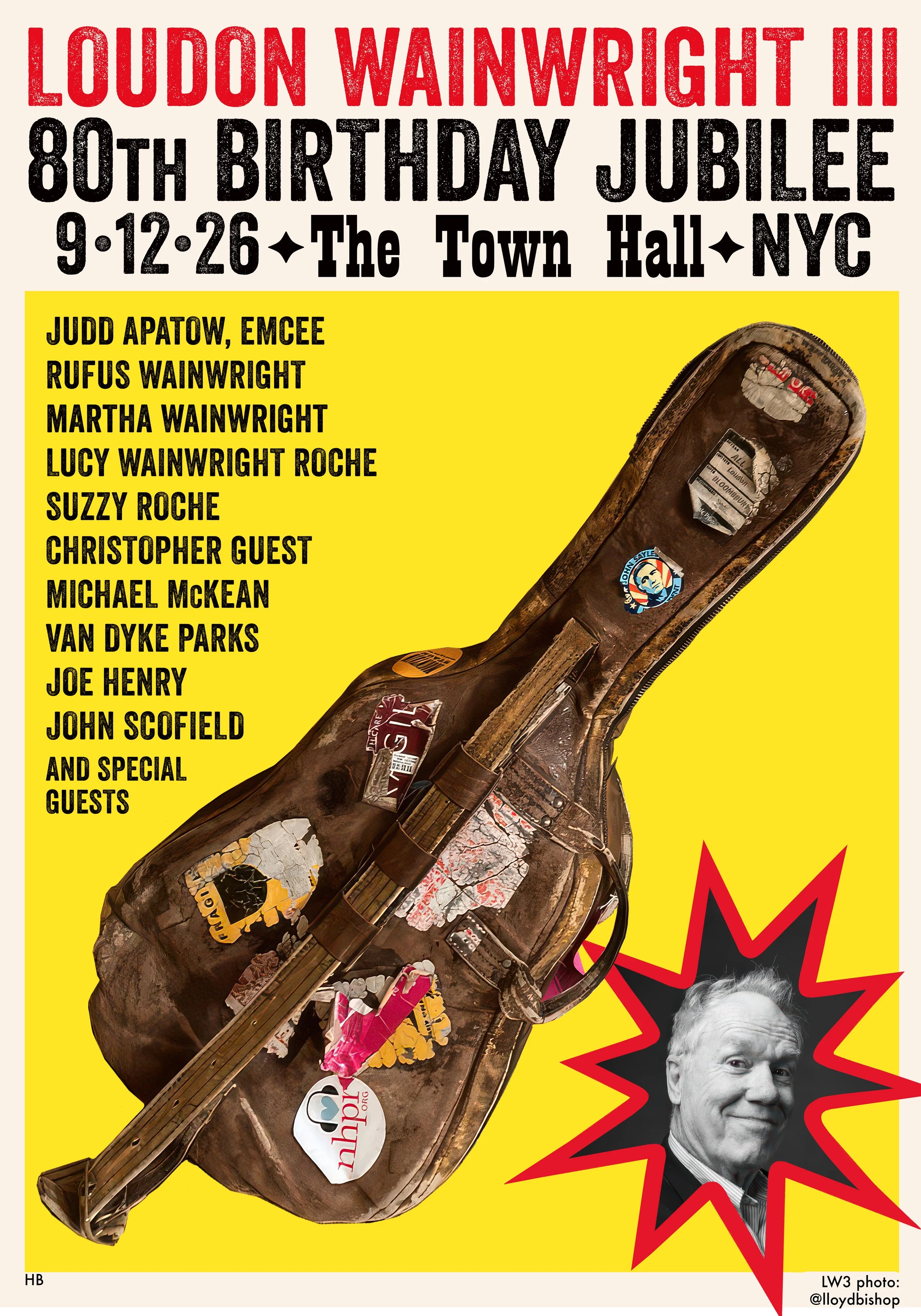 In September, I will hit 80 years old, and the plan is to put on a concert at Town Hall in New York. The date is Saturday September 12. You might think, “That's a scary idea, doing a big show for your birthday. Suppose you screw it up somehow or, even worse, what if nobody buys tickets? Bummer.” My solution: the lineup would include my ridiculously talented family, including my kids, Rufus and Martha, and Lucy Wainwright Roche. Not only that, but I'd get Judd Apatow to be the emcee, and I'd also invite old friends and legends to play—folks I’ve performed and recorded with for more than half a century: Joe Henry, Christopher Guest, Michael McKean, John Scofield, Suzzy Roche, Chaim Tannenbaum, David Mansfield, Teddy Thompson, Dave Hill, Wesley Stace, Sloan Wainwright, and Van Dyke Parks. Plus surprise guests!